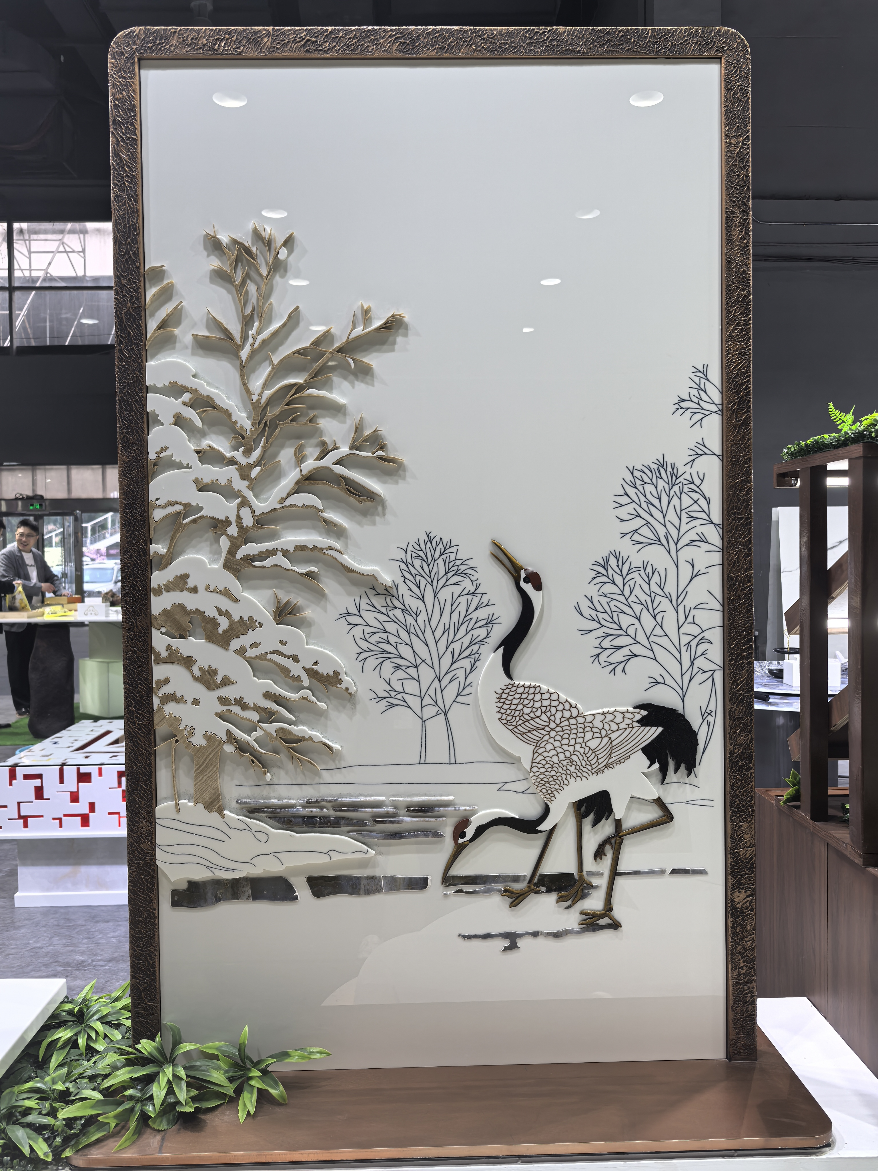 此次东方晶硅带来的雕刻与低温打印结合的艺术画——《嬉》,工艺精湛、栩栩如生。画中,两只丹顶鹤于雪压枝头下觅食嬉戏,灵动非凡。雪花之轻盈、树枝之苍劲,与丹顶鹤之翩翩风姿交相辉映,共绘一幅和谐共生、美不胜收的画卷。作品以东方晶硅为基材,通过精妙的雕刻工艺,将细腻的树枝与雪景轮廓勾勒而出,同时,结合低温打印技术,进行上色与细节处理。这件作品不仅展示了东方晶硅在材质应用上的创新与突破,更体现了雕刻与低温打印技术的完美结合,为设计界带来了一股新的潮流与风向标。
