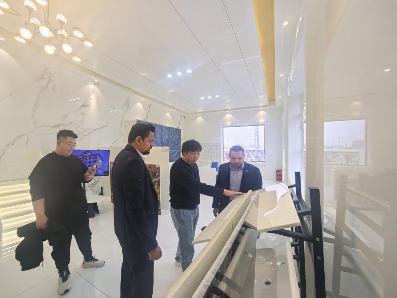 孔乐然一行参观了兴固科技办公楼、东方晶硅精品展厅、东方晶硅生产线。亲身体验了桌面产品、一体盆、奢石、装配式建筑等产品的性能和实际效果。